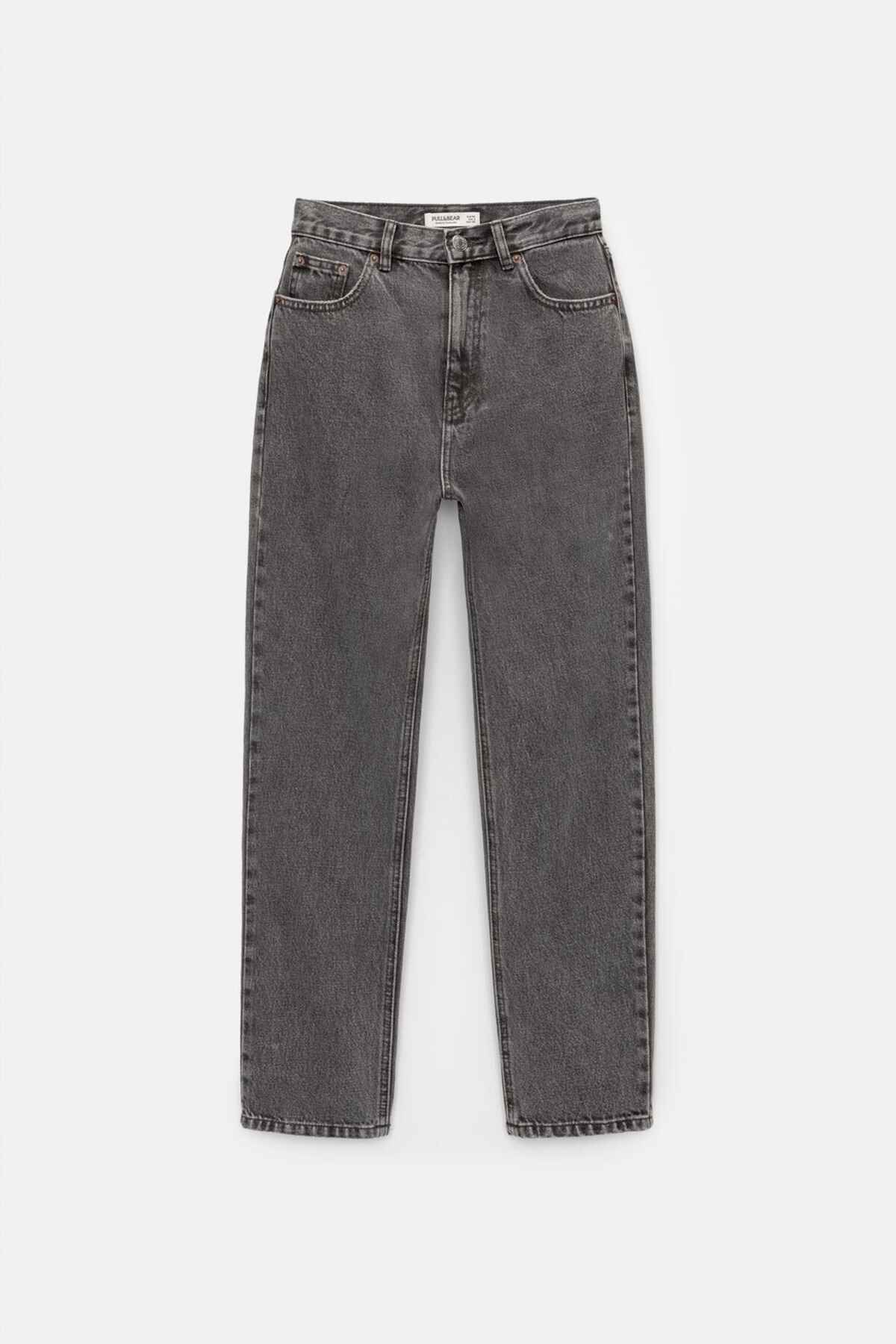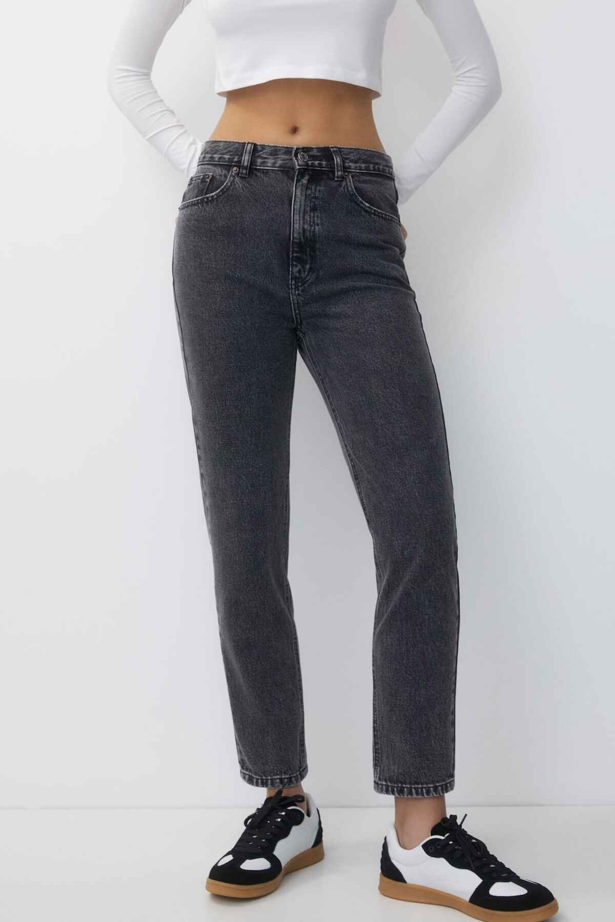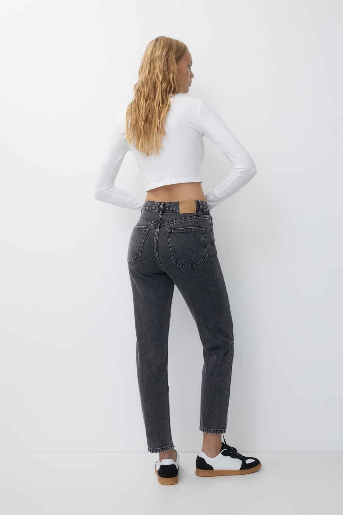 - Basic mom jeans with a five-pocket design, belt loops, and zipper fly and top button fastening. Made from stiff 100% cotton. Inseam length: 70.40 cm. Difference to the standard length model: Petite: – 7 cm; Tall: + 6 cm.