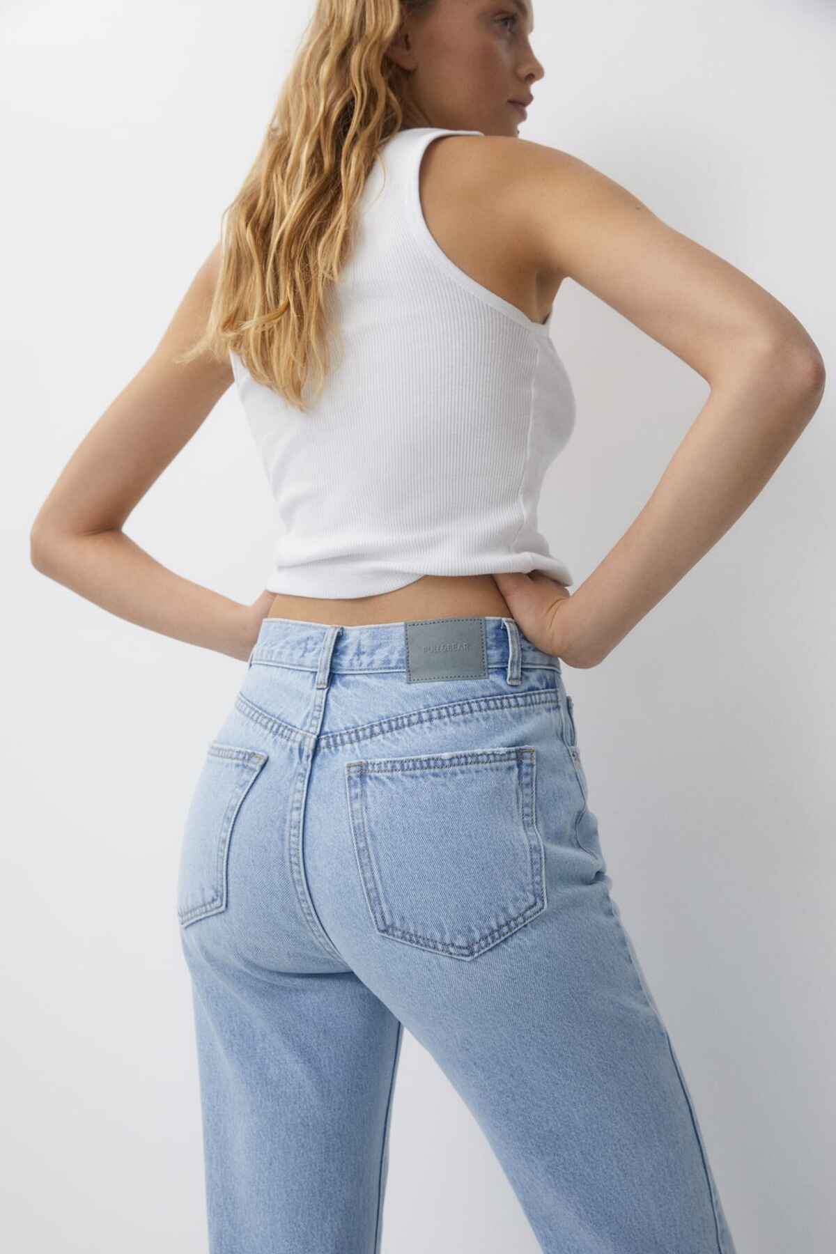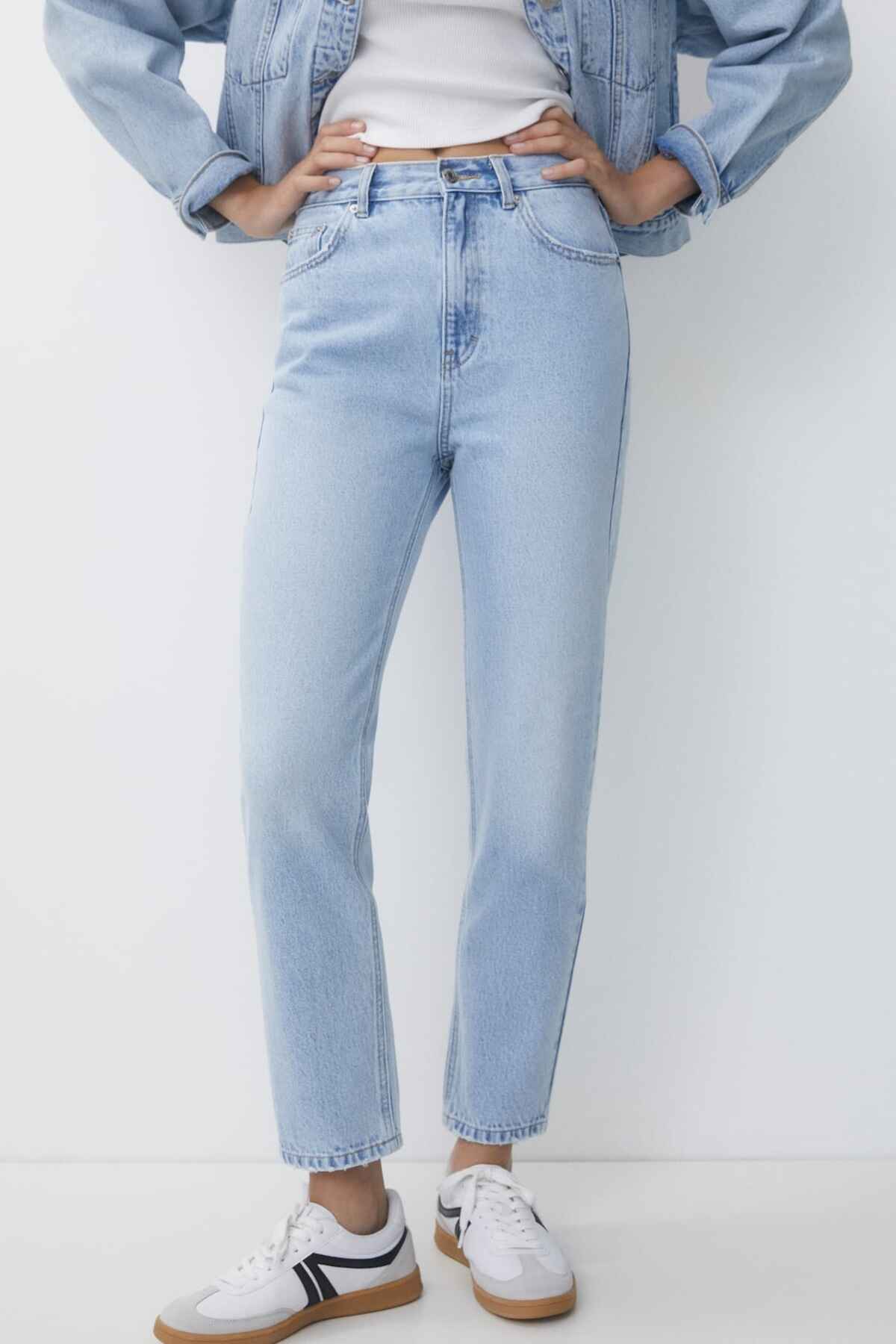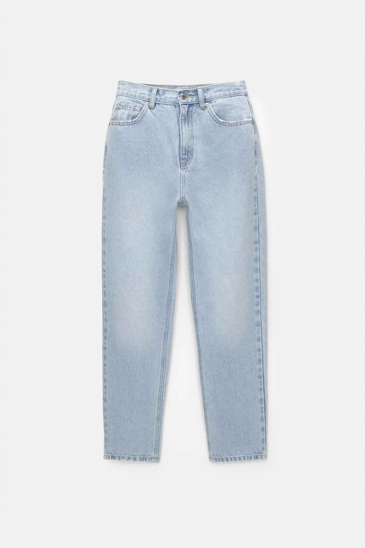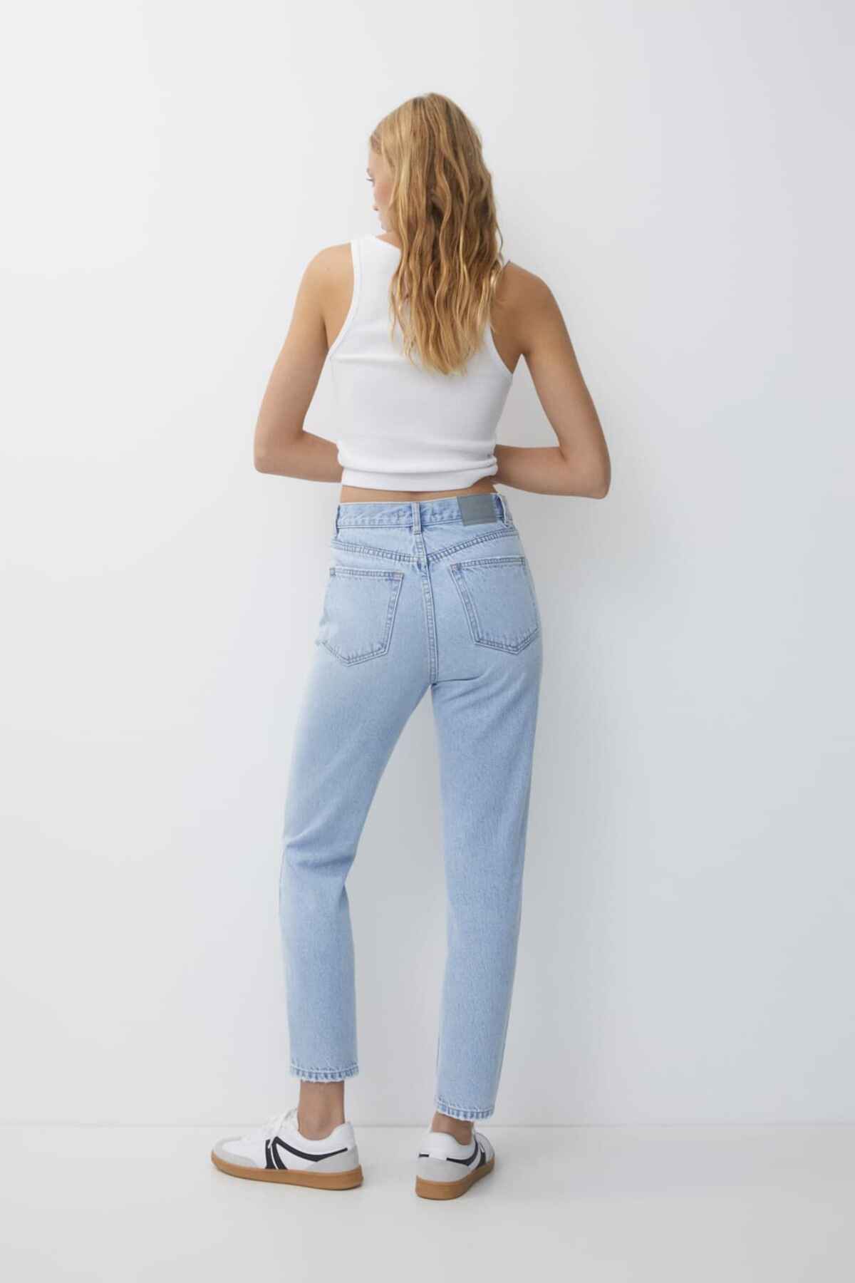 - Basic mom jeans with a five-pocket design, belt loops, and zipper fly and top button fastening. Made from stiff 100% cotton. Inseam length: 70.40 cm. Difference to the standard length model: Petite: – 7 cm; Tall: + 6 cm.