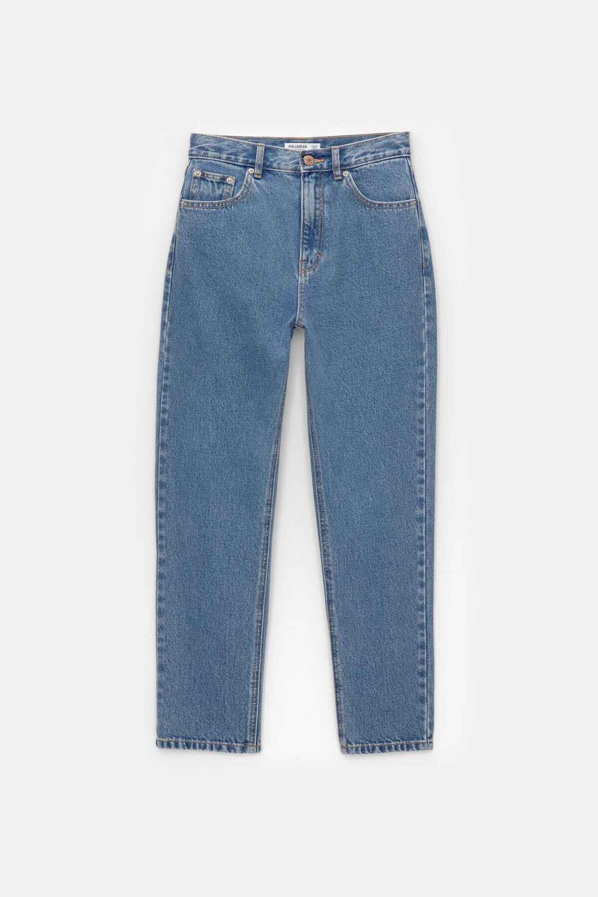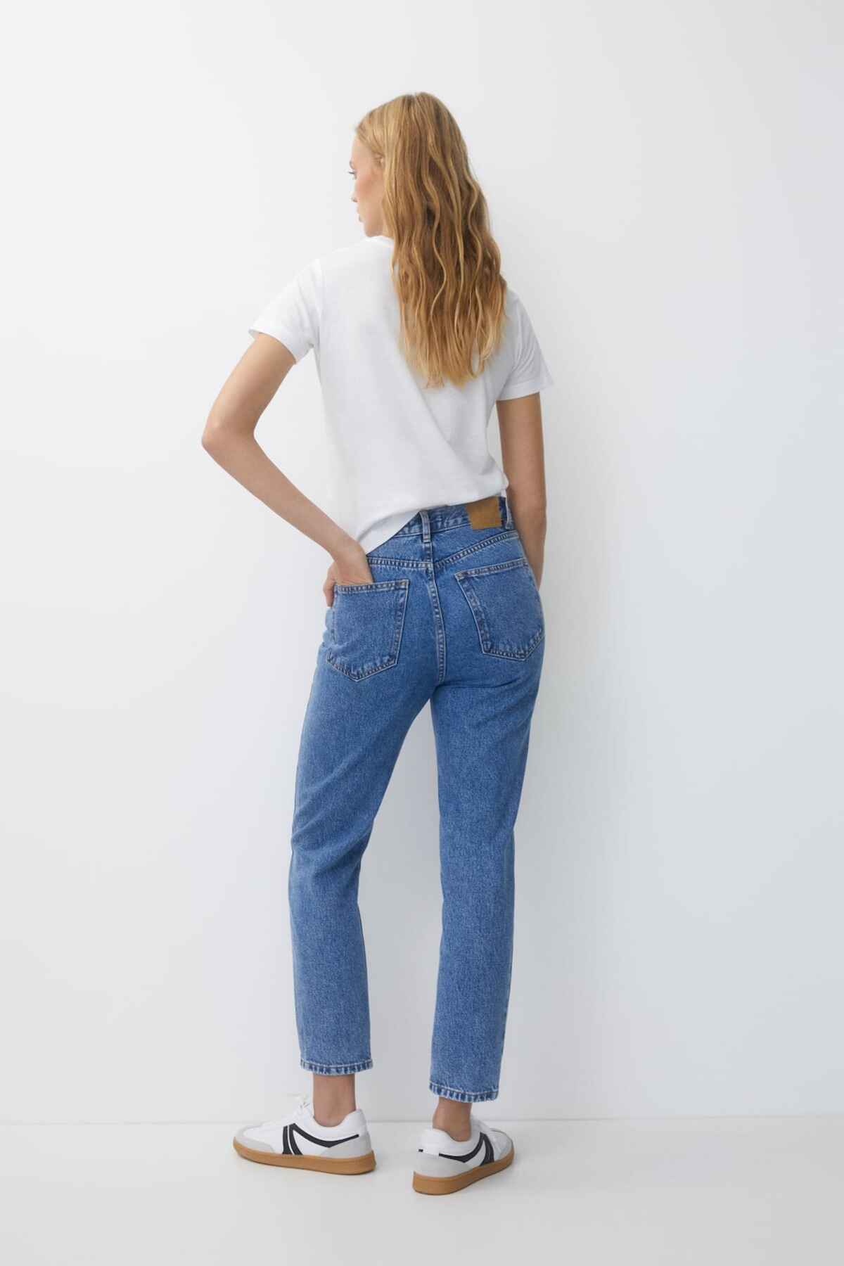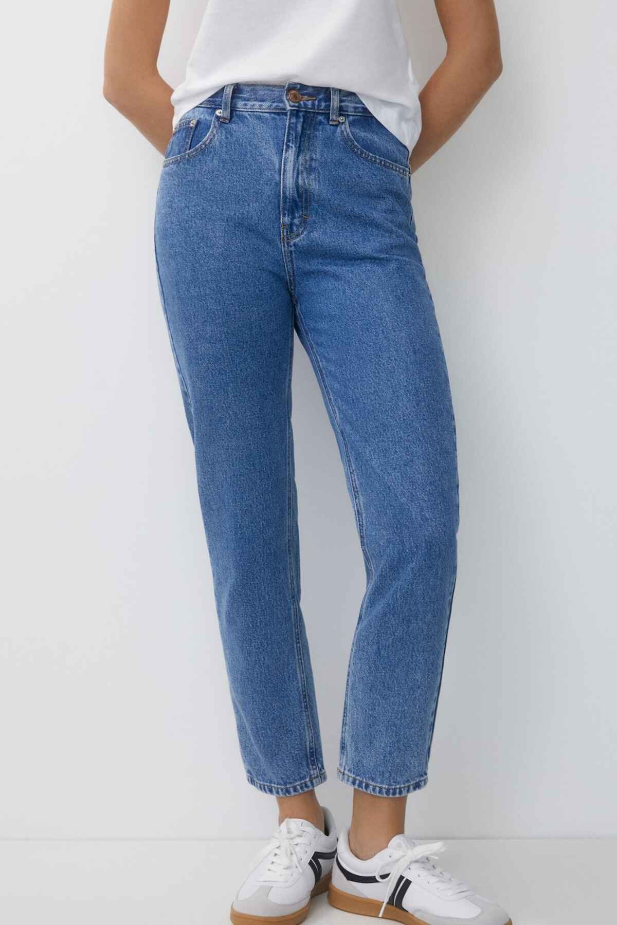 - Basic mom jeans with a five-pocket design, belt loops, and zipper fly and top button fastening. Made from stiff 100% cotton. Inseam length: 70.40 cm. Difference to the standard length model: Petite: – 7 cm; Tall: + 6 cm.