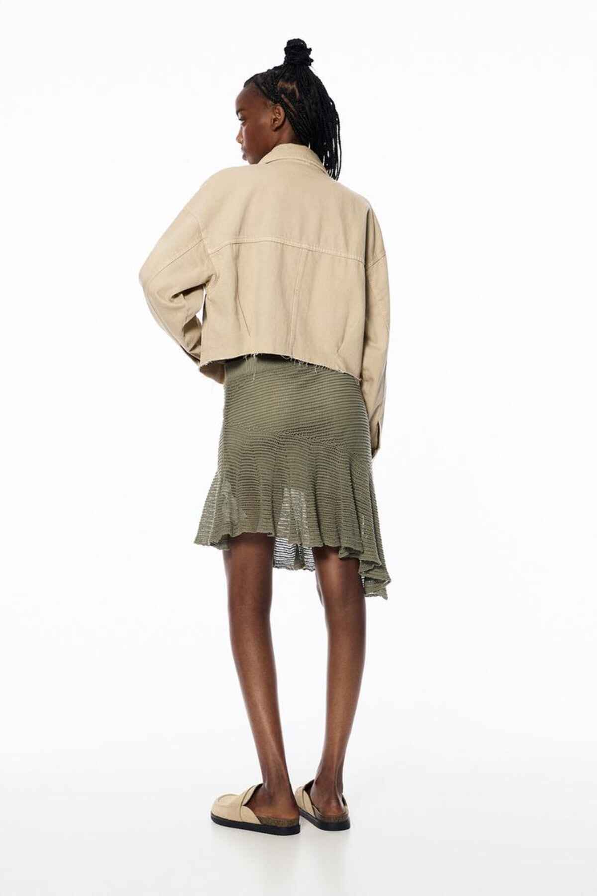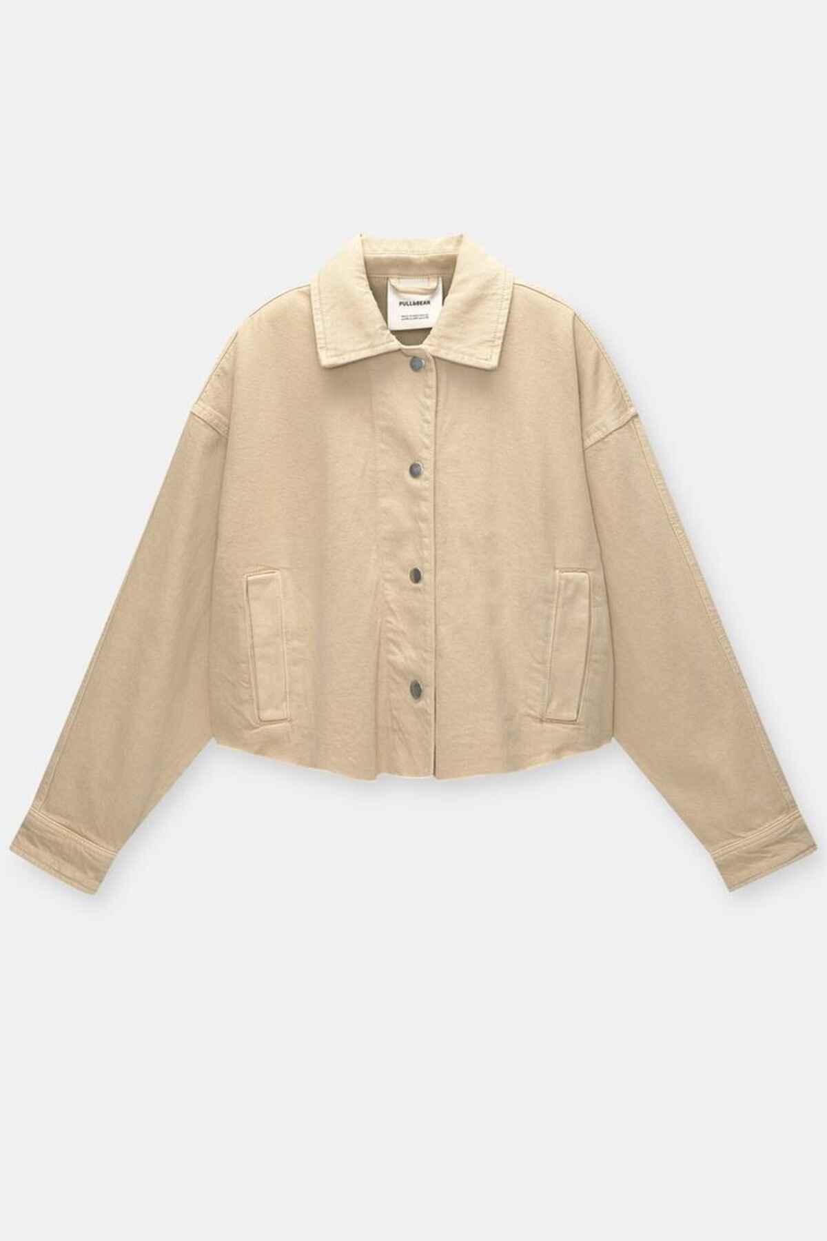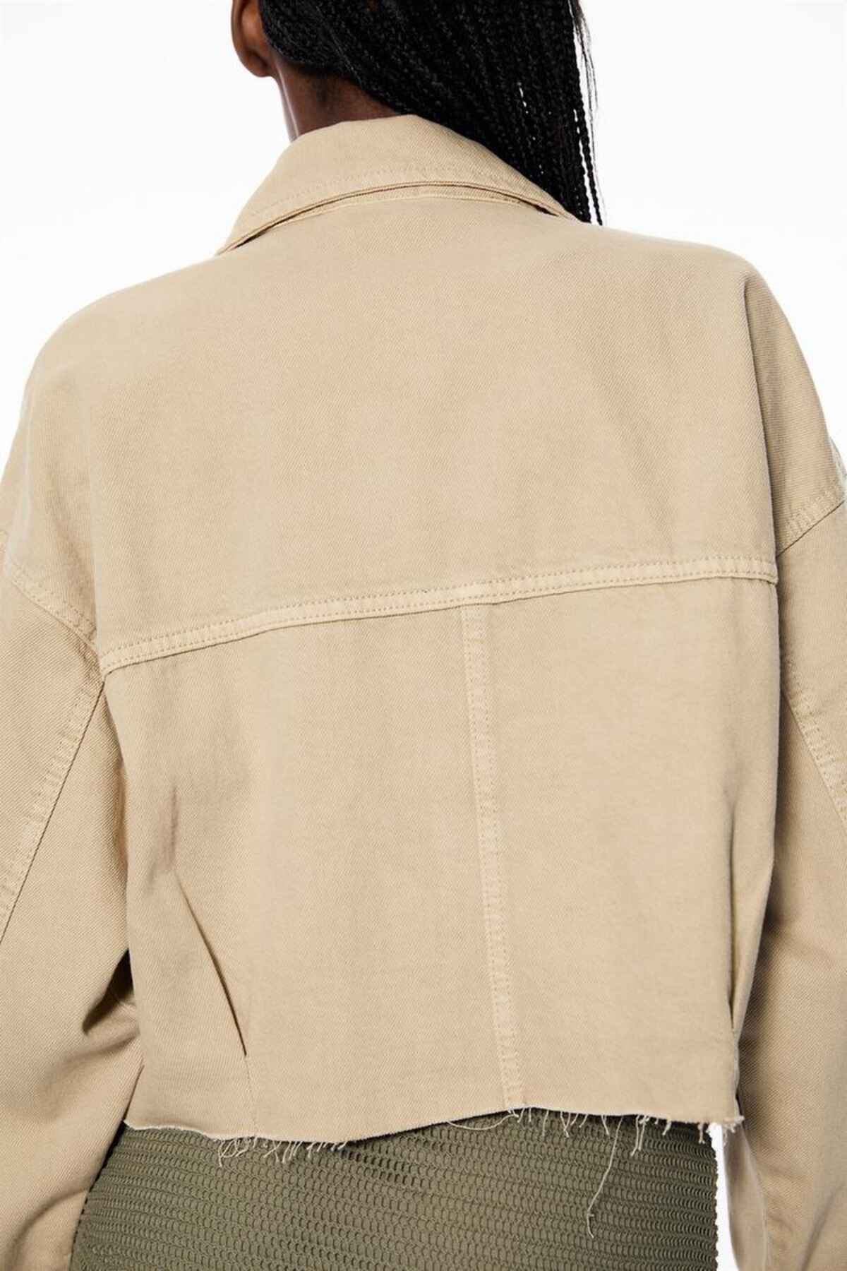 Model size: S Model height: 175 cm Colour: Sand Cropped jacket with pleated detailing on the back, a frayed hem, pockets and button-up front.