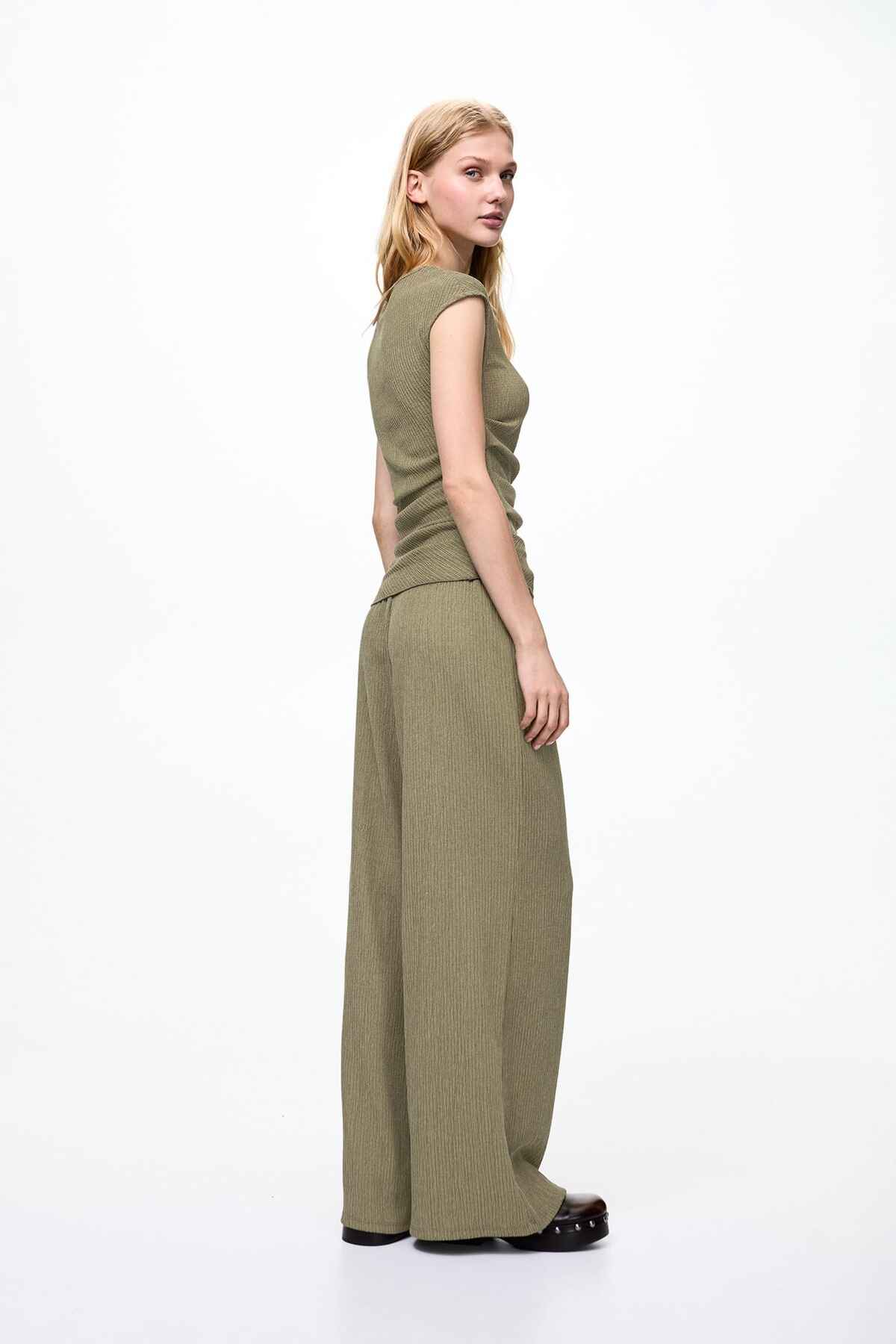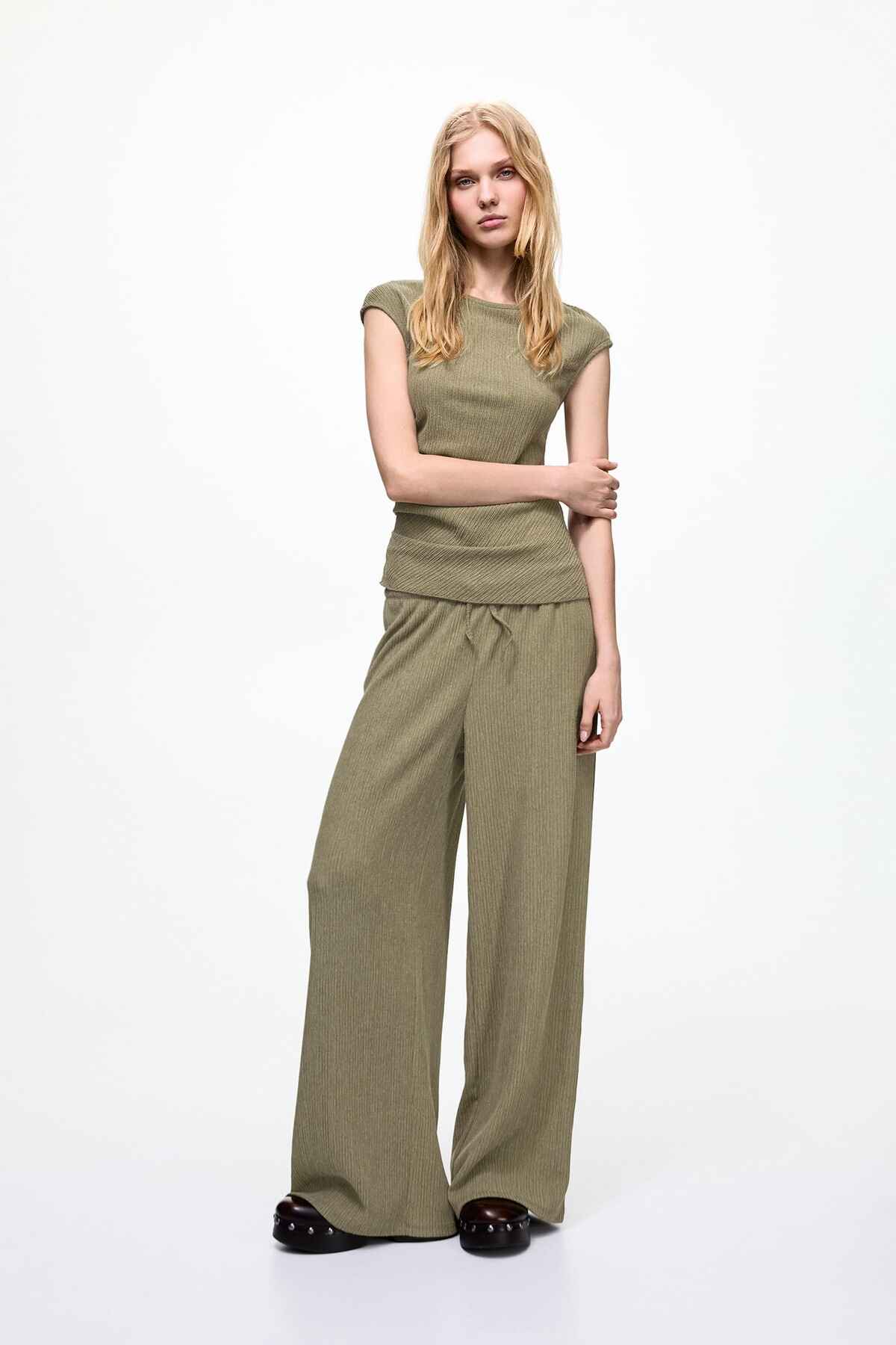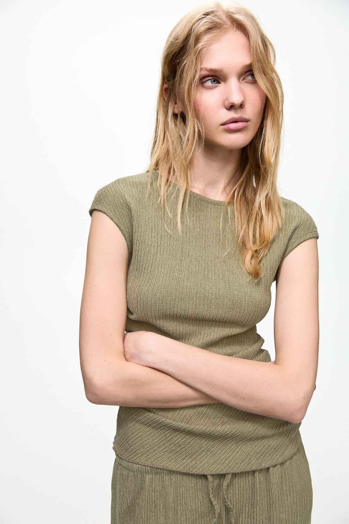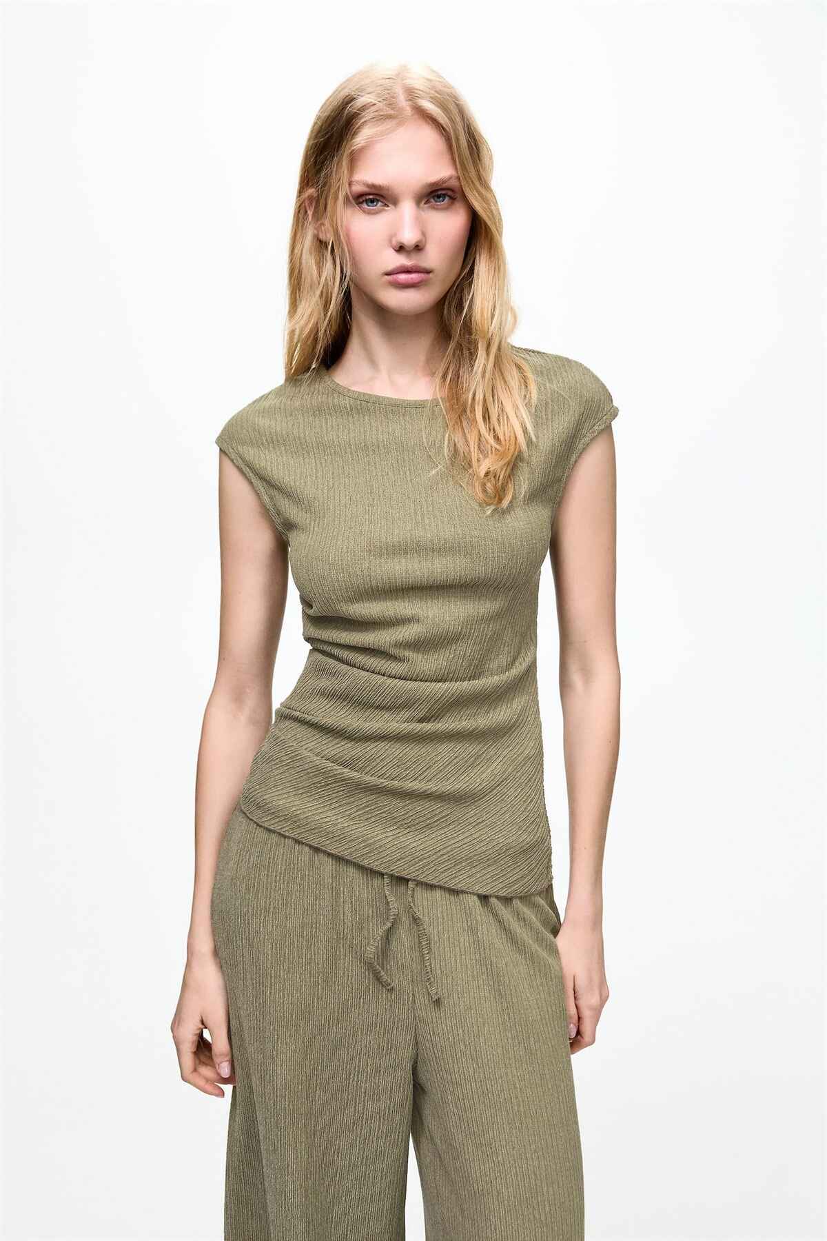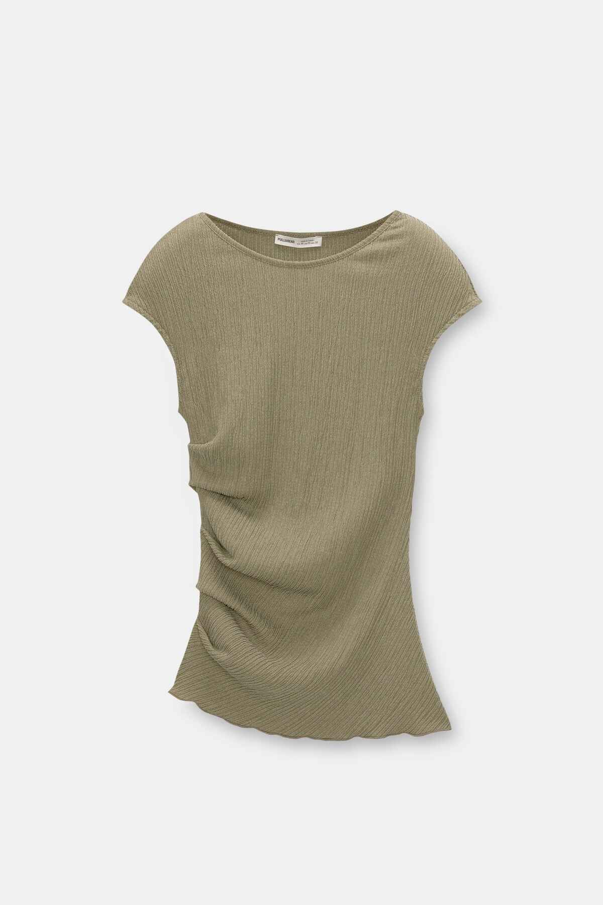 Model size: S Model height: 177 cm Colour: Khaki Rustic sleeveless crepe T-shirt with gathered detail on the side and a crew neck. Made of stretch fabric.
